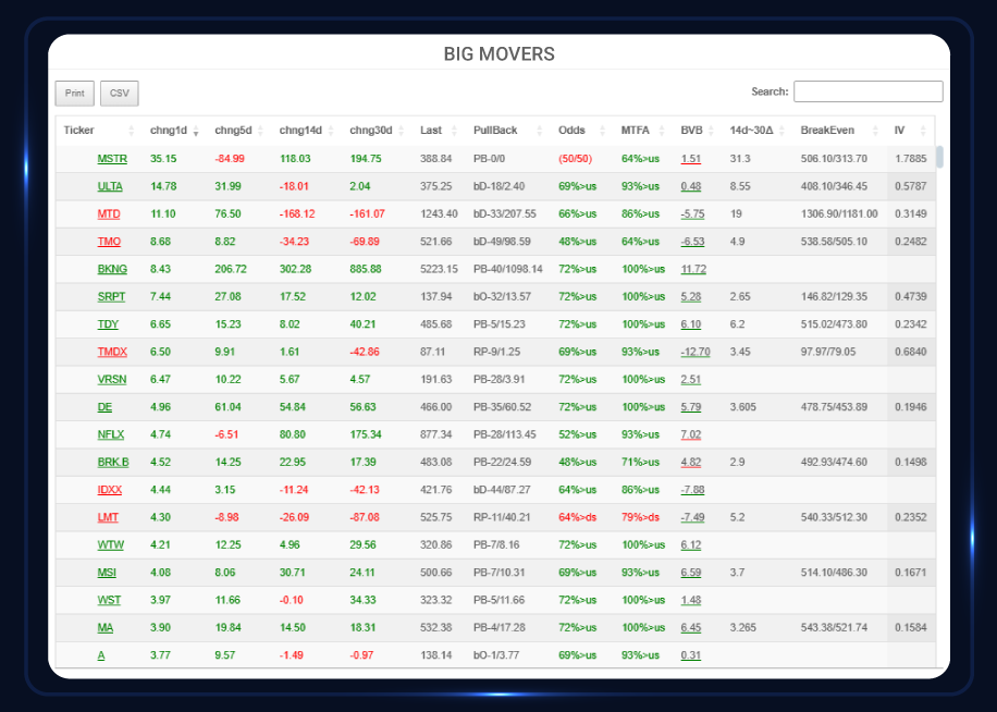 At the bottom of the dashboard, you can see Big Movers section. This section showcases the stock's performance over the past 14-day, 5-day, and 1-day intervals, making it simple to spot big movers. These insights act as a compass, guiding you to stocks experiencing extreme volatility or momentum, positioning you to capitalize on these dramatic shifts with precision.