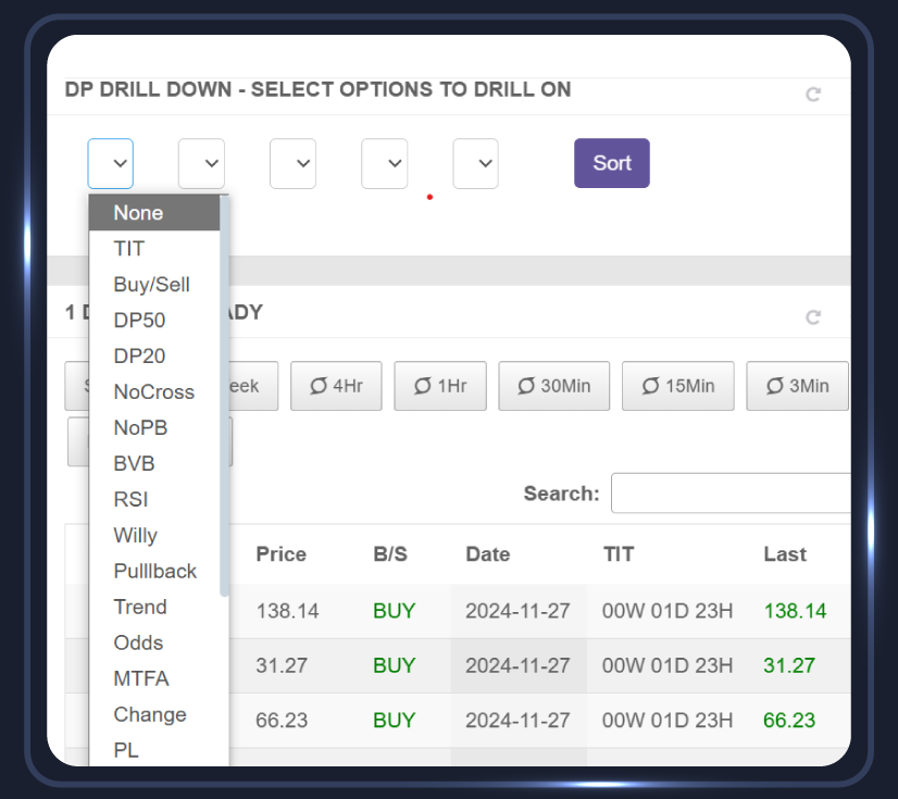 In the example above, the selected filters—DP50, No Crossover, NoPB, Odds, and PL—work together to refine your market analysis. DP50, chosen in the first dropdown, represents the Relative Strength Index (RSI) calculated over a 50-period timeframe, a time-tested indicator of market momentum. The next filter, No Crossover, signals that no crossover events are present, while NoPB indicates the absence of pullback activity.