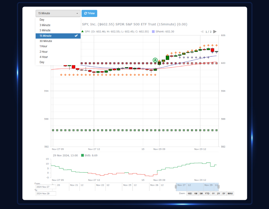 - The MTF (Multi-Timeframe) Analysis Diagram shows you how a stock is trending across 10 different timeframes—from quick 3-minute snapshots to long-term weekly views.