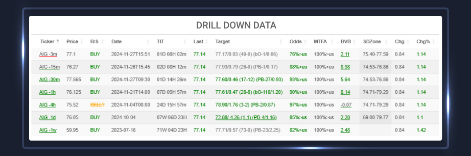 Under this Chart some very interesting data will load up. For the selced ticker which is AIG, you'll see MTF data such as 3 minutes ,15 minute, 30 minutes, 1 hour and so on. This Table for AIG stock tells a clear story: BUY is the hero across almost every timeframe, with prices climbing steadily toward their targets. The short-term charts (3m, 15m, 30m, 1h) are like a confident sprint, while the daily and weekly charts show a marathon of long-term growth. But there's a twist—the 4-hour chart hints at a hurdle, suggesting a possible pullback near resistance zones. Still, the overall trend is strong, and success rates are high. In this tale, AIG looks like a solid winner, but keep an eye on the 4-hour villain for any surprises!